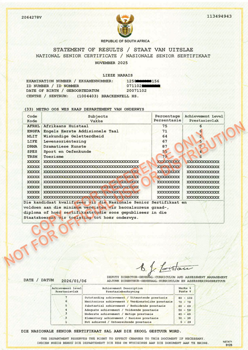 • National Senior Certificate – Bachelor’s Pass (2025)